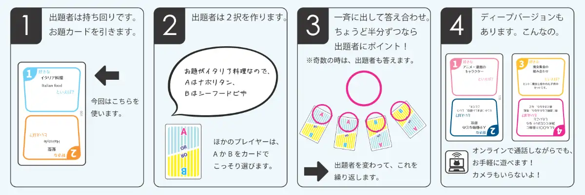 奇数で遊ぶときは、お題を言った人はA/Bを出しません。偶数で遊んだ時は、お題を言った人も出します。