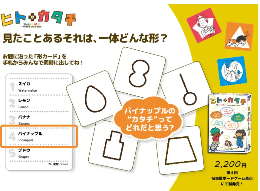 2~6人で遊べる協力ゲームで、お題に沿った「形カード」を出し、全員が5回一致すればプレイヤー側の勝利となります。