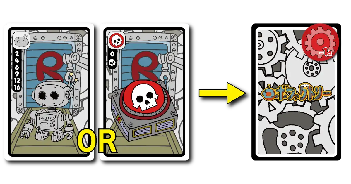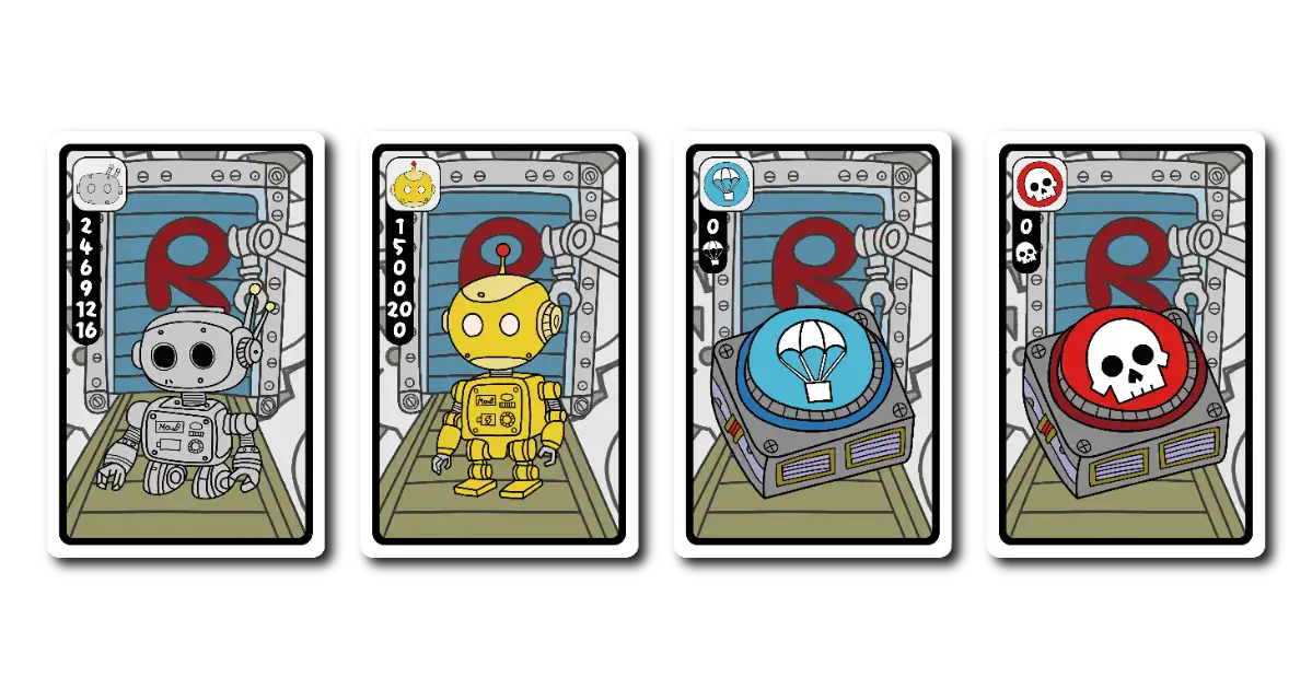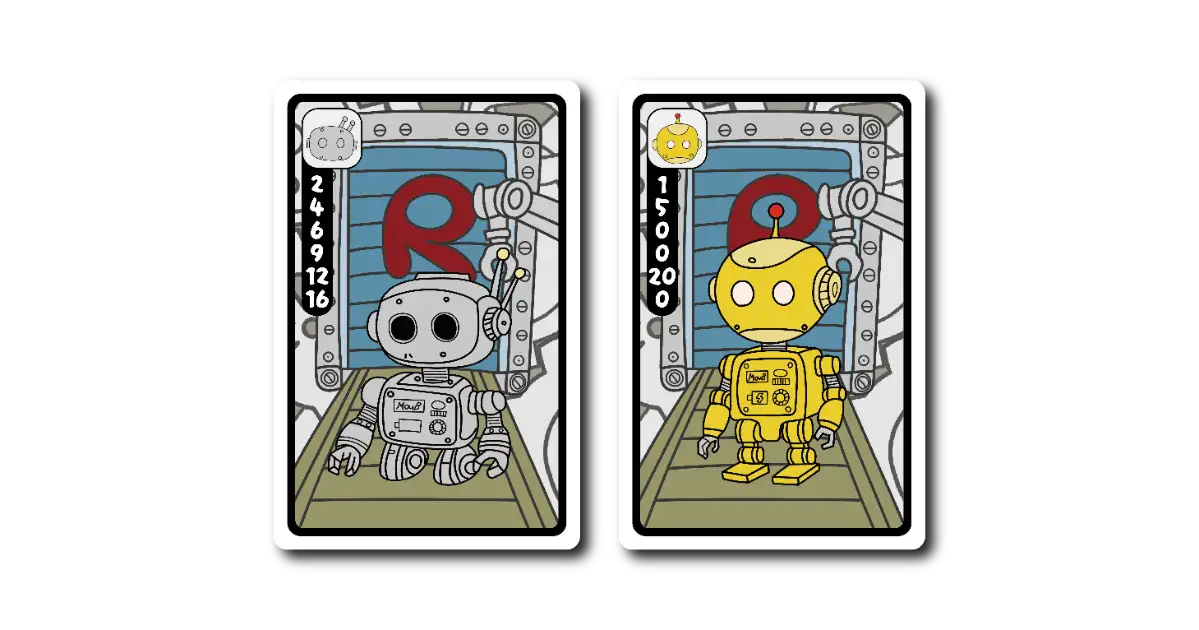 右側の金ロボは、1枚だと1点ですが、2枚で5点に!でも、3枚/4枚獲得すると0点に...?