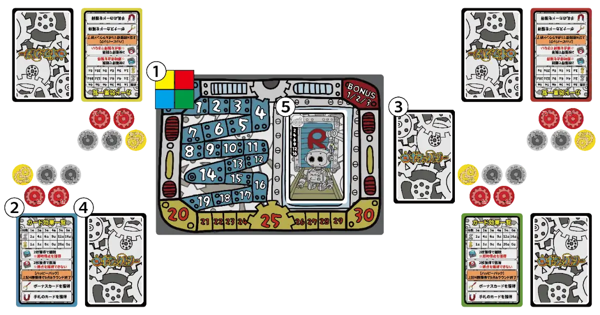 ⑤ 山札から1枚めくり、得点ボード上の右側に表向きで置きます。このカードがボーナスカードです。
