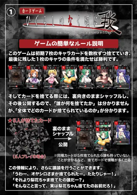 ゲームマーケット大賞2019優秀賞受賞作の大人気カードゲーム「斯くして我は独裁者に成れり」をベースに、「ひぐらしのなく頃に」の世界観に合わせた新ルール・新要素を追加した内容となっています。